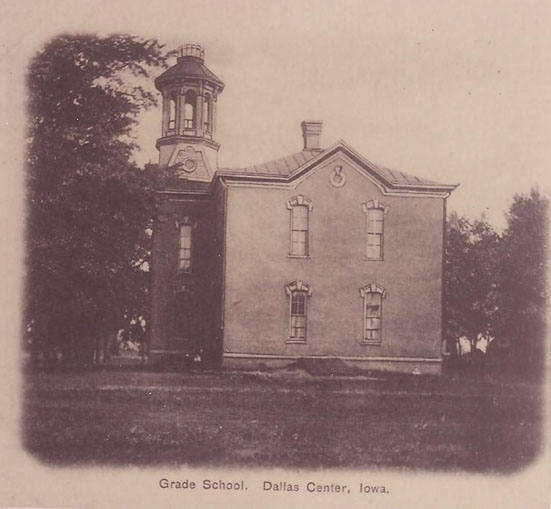 This biulding was built in 1874. It was the first public facility in Dallas Center to include high school. It was handsome by every measure. Imagine such relief work as that on the bell tower and the lintels on a school building built today. The cupola/bell tower atop the stair case was most likely designed for air flow to cool the building; warm air rising through the tower pulled cooler outside air in through the open windows. The vane on top of the tower may have turned with the wind, increasing air flow. But if it let hot air out how did it keep the rain out? The doors in the ground, lower front center, suggest that there was a basement, most likely for a gravity flow furnace and maybe restrooms. If so, it was a design repeated in the high school building we knew. It probably didn't have electricity when it was built It must have been a pride of Dallas Center in its time, most likely its largest building then. Of the six children in my Mother's family, five graduated from high school in Dallas Center, three from this building. I suspect that this didn't become the "grade school" as labeled until after the high school building we knew was built in 1903--Carl.